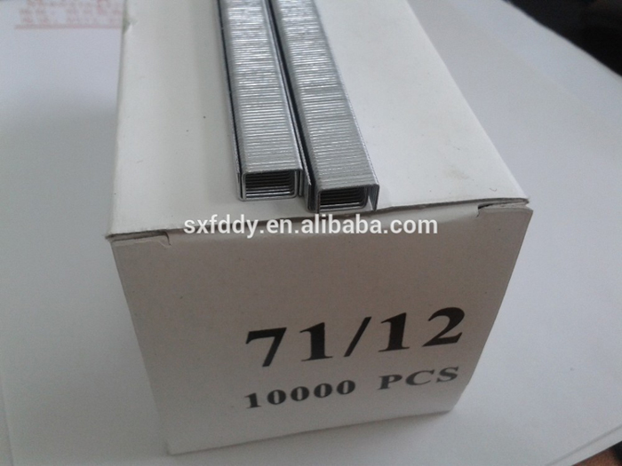71/16 Chinese furniture industrial staples 1. Packing:10000pcs/box, 20boxes/carton. 2. N.W.20.6KG G.W. 21.1KG 3. Meas: 370*330*150mm 4. Box and carton can be printed as your design |