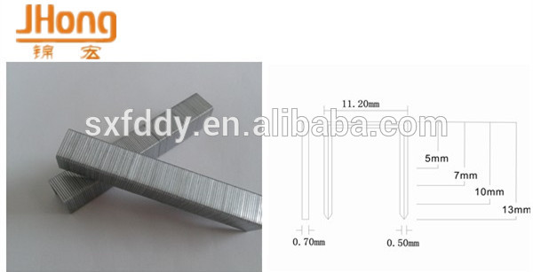 1005F Fine Wire Upholstery Staple 1. 7500pcs/box, 40boxes/carton 2. N.W. 17.60KG 3. G.W. 18.00KG 4. Meas:330*310*130mm |