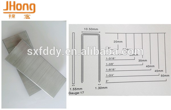 14/50 manufacture furniture staple pins 1.10000pcs/box 2. N.W. 12.60KG 3. G.W. 13.00KG 4. Meas:290*170*130mm |